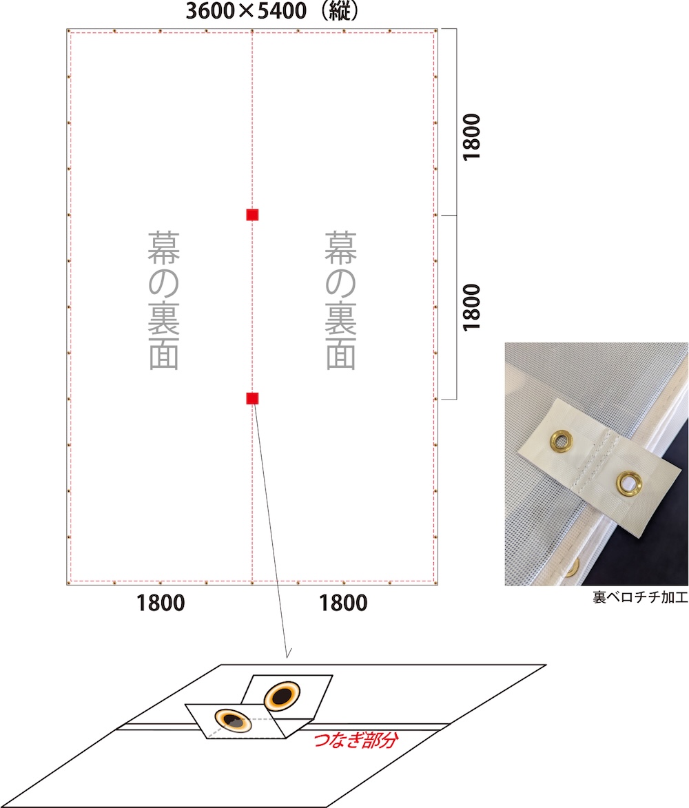 幕の裏面に2つのハトメが付いたターポリン生地を部分的に縫い付ける加工です。金額は安価ですが、単管に固定することで煽り止め効果がでます。