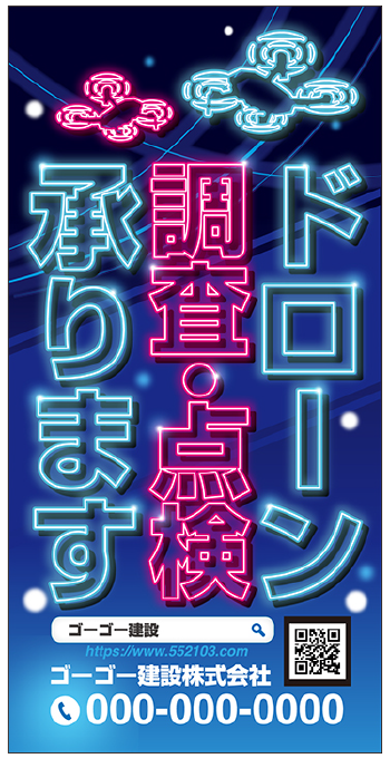 当サイトでは、ネオンデザインを取り入れた現場シートのデザインテンプレート(im355)をご用意しています。ドローンのイラストを採用した構成で、ドローン点検・屋根調査を行う企業を中心にお使いいただけるデザインです。