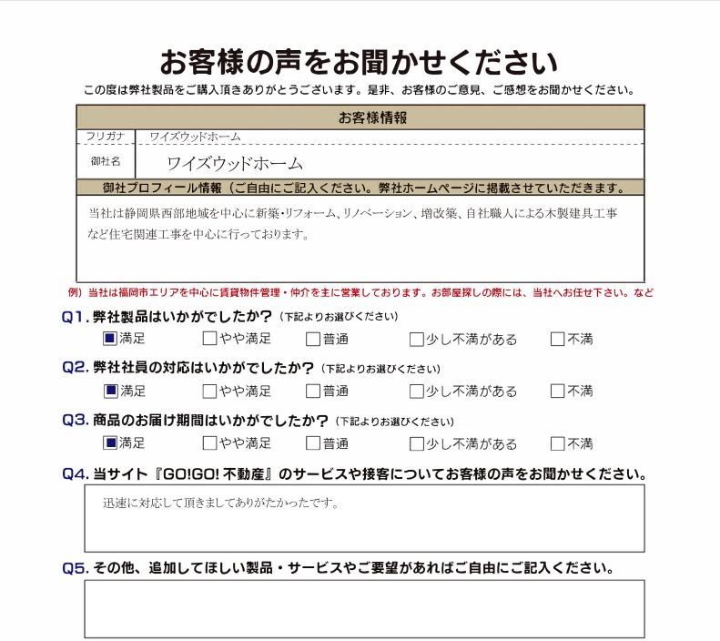 静岡県磐田市 ワイズウッドホーム様より設置事例のお写真とお客様アンケートをお送りいただきましたのでご紹介いたします。この度はGO!GO!不動産をご利用いただき、誠にありがとうございます。
